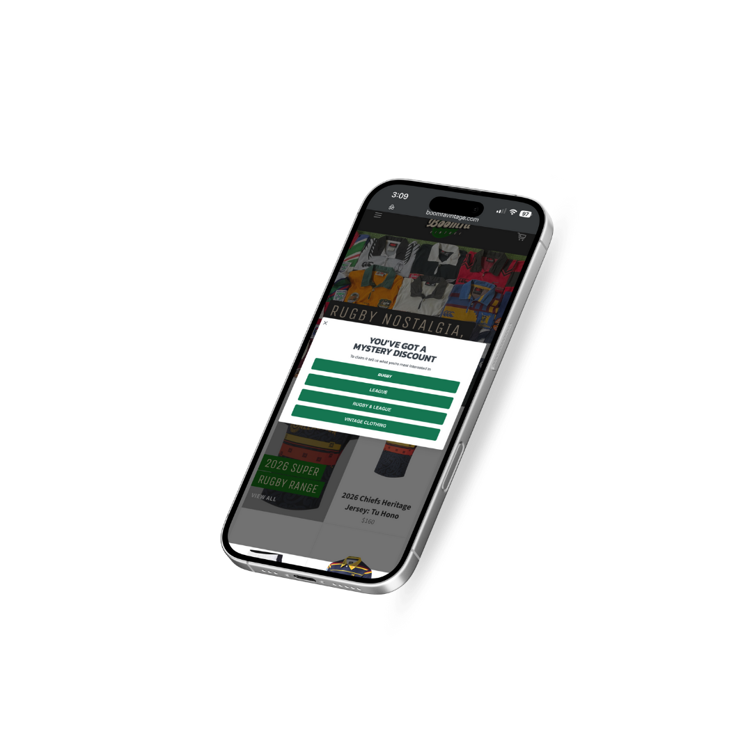 We redesigned the sign-up experience and welcome series. The new pop-up achieves a 4.74% opt-in rate, while capturing customer preferences (rugby vs rugby league vs vintage style).